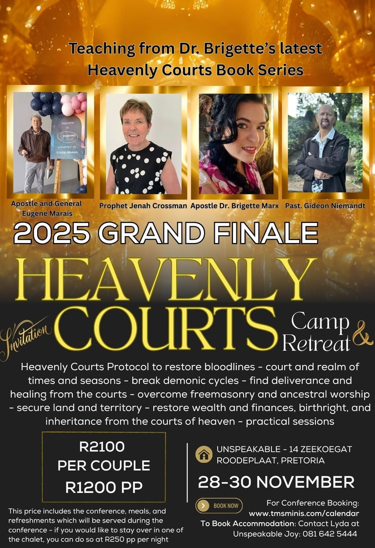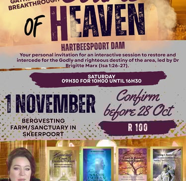 Join Dr. Brigette Marx for an extraordinary and life-transforming Heavenly Courts Retreat & Camp — a divine gathering unlike any other. Step into the realms of Heaven’s government and encounter the living reality of God’s throne, His councils, and His scrolls for your life and destiny.